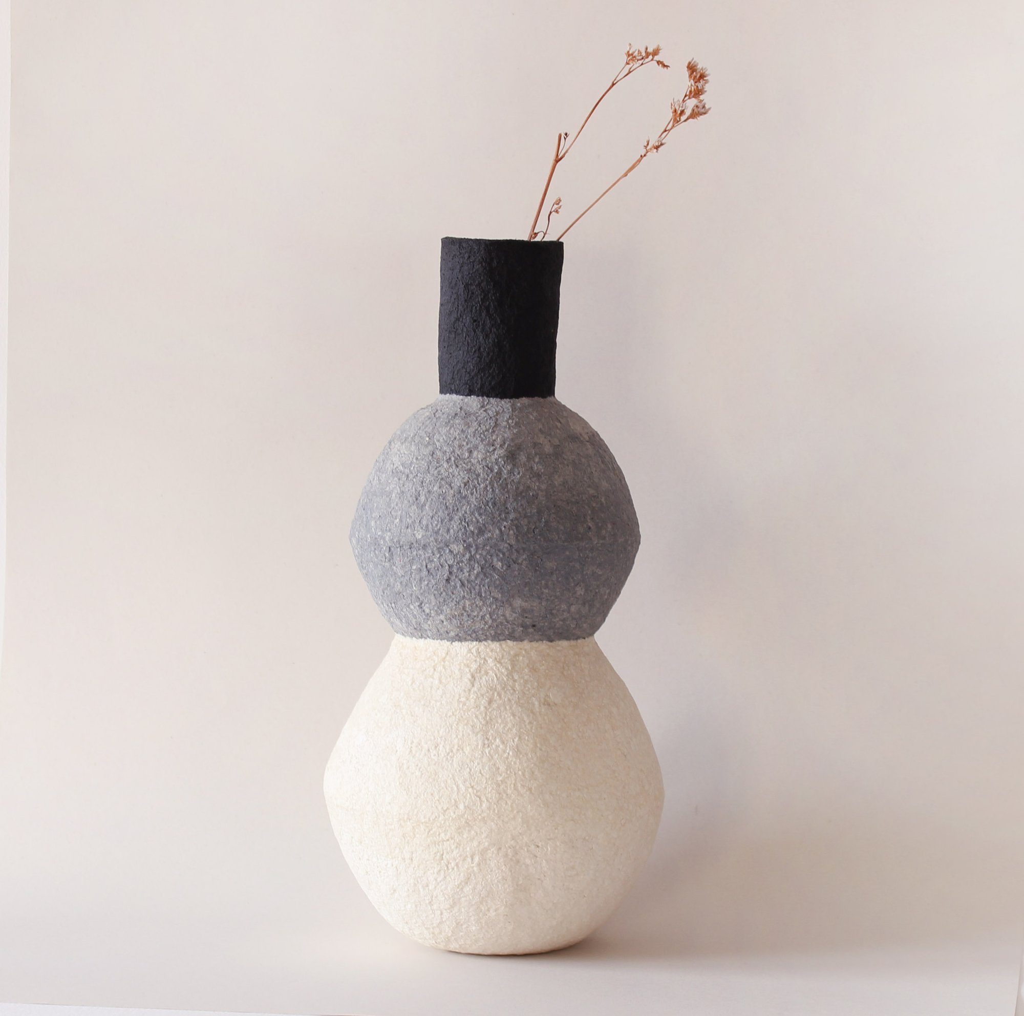Este es una jarrón creado manualmente con distintos tipos de papeles, el negro y el blanco viene de cartulinas recicladas y el gris de los periódicos que reciclo de mi padre, aunque normalmente las piezas de Marcela Luna están realizadas con los restos de papel que sobran de los papercuts que corto en el estudio. Son piezas muy especiales ya que cierran un ciclo creativo donde nada se tira y cada trozo de papel tiene la misma importancia.